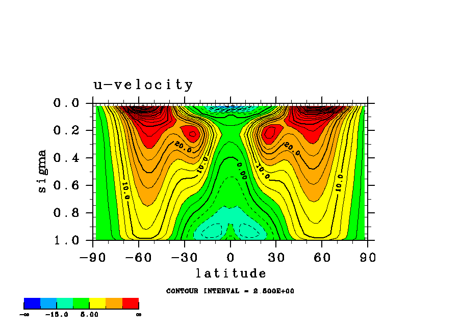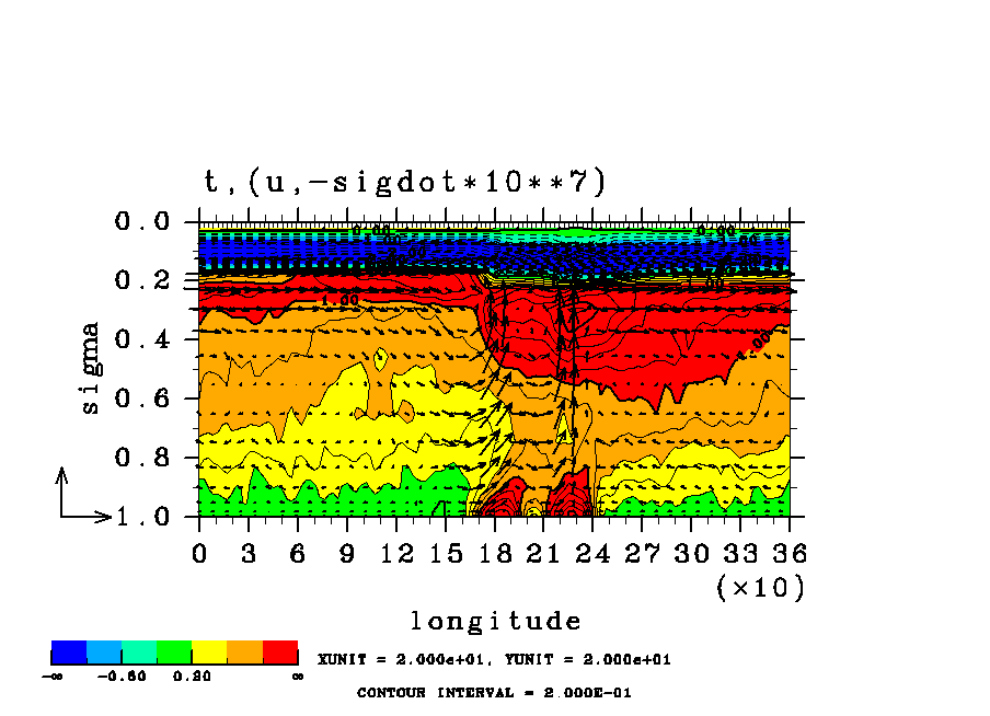 温度 + (u, -SigDot) の (x,z) 断面 at 赤道