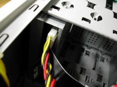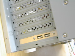 最近は良く見る前面 USB 2.0 および IEEE 1394 コネクタ, そして音声入出力. この内側からマザーボードに伸びているケーブルを取り外していきます. |