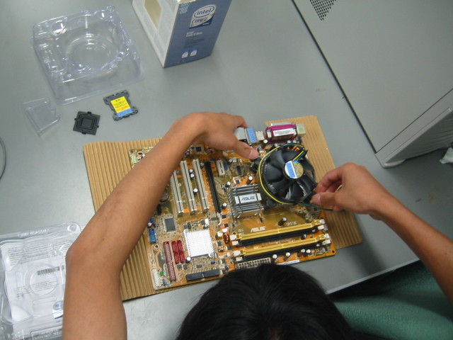 マザーボードへの CPU, CPU ファンの取り付けは厚紙の上で. (背面を傷つけないように)