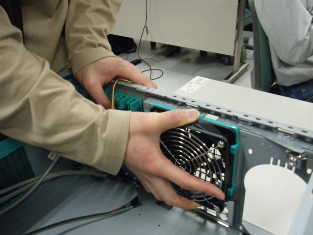 CPUが適切に取り付けられていることが確認できたら, 組み立て作業に戻ります. M/Bおよび電源の電源を落としてから, 電源ケーブルとグラフィックボードを取り外してください. 次に筐体背面のファンをスライドさせて取り外します.