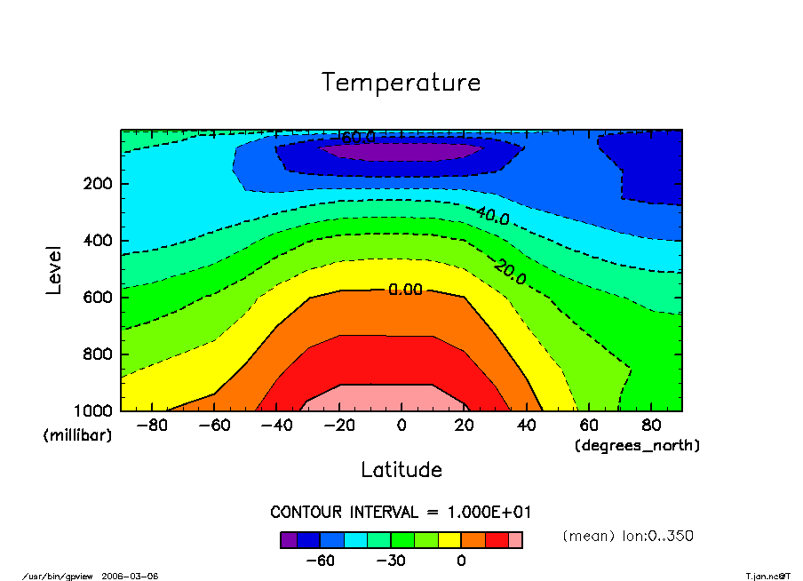 --mean オプションを使うとある軸方向に平均をとったデータで絵を書くことができます。T.jan.ncをつかってさくっと1月の帯状平均温度を書いてみましょう。