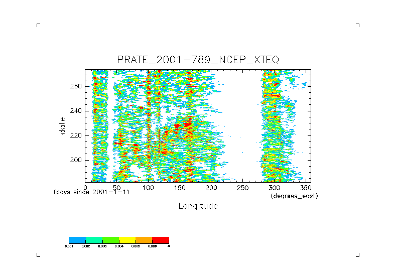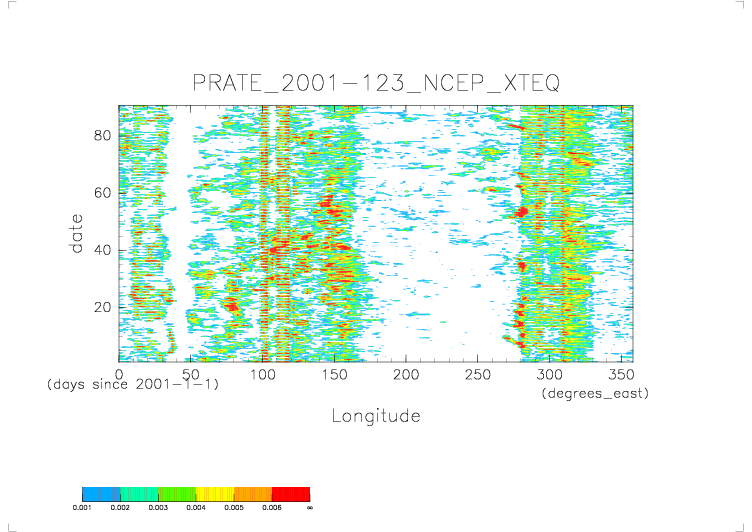 ../../Precip.2001.daily.NCEP/daily_PRATE* から得た X-T ダイアグラムの図. 赤道(latitude=0).