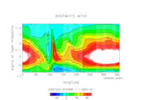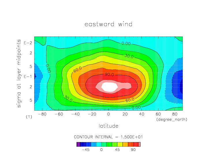 東西風. 赤道断面 (鉛直座標は対数プロット) |