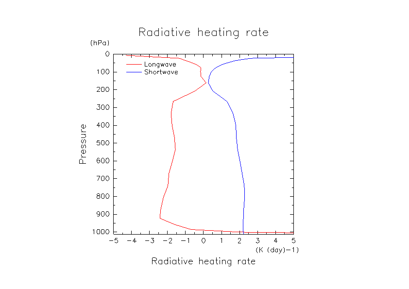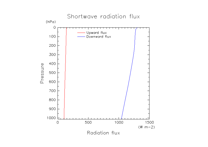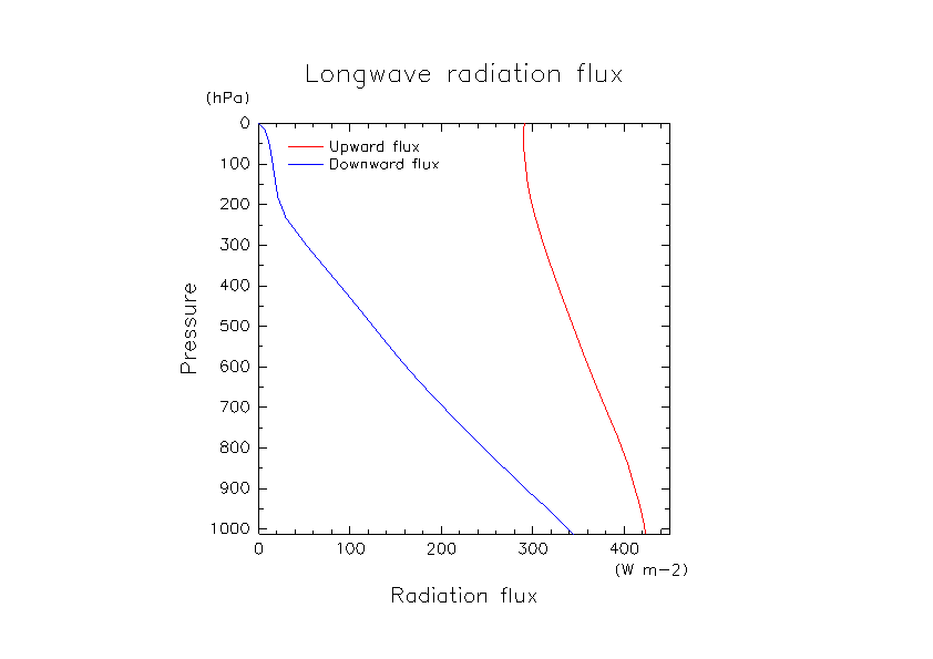 鉛直 1 次元設定で, 温度, 水蒸気プロファイルを与えた場合の放射フラックスの計算.