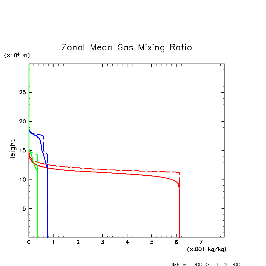 凝結成分気体混合比の水平・時間平均(赤: H2O, 緑: H2S, 青: NH3)